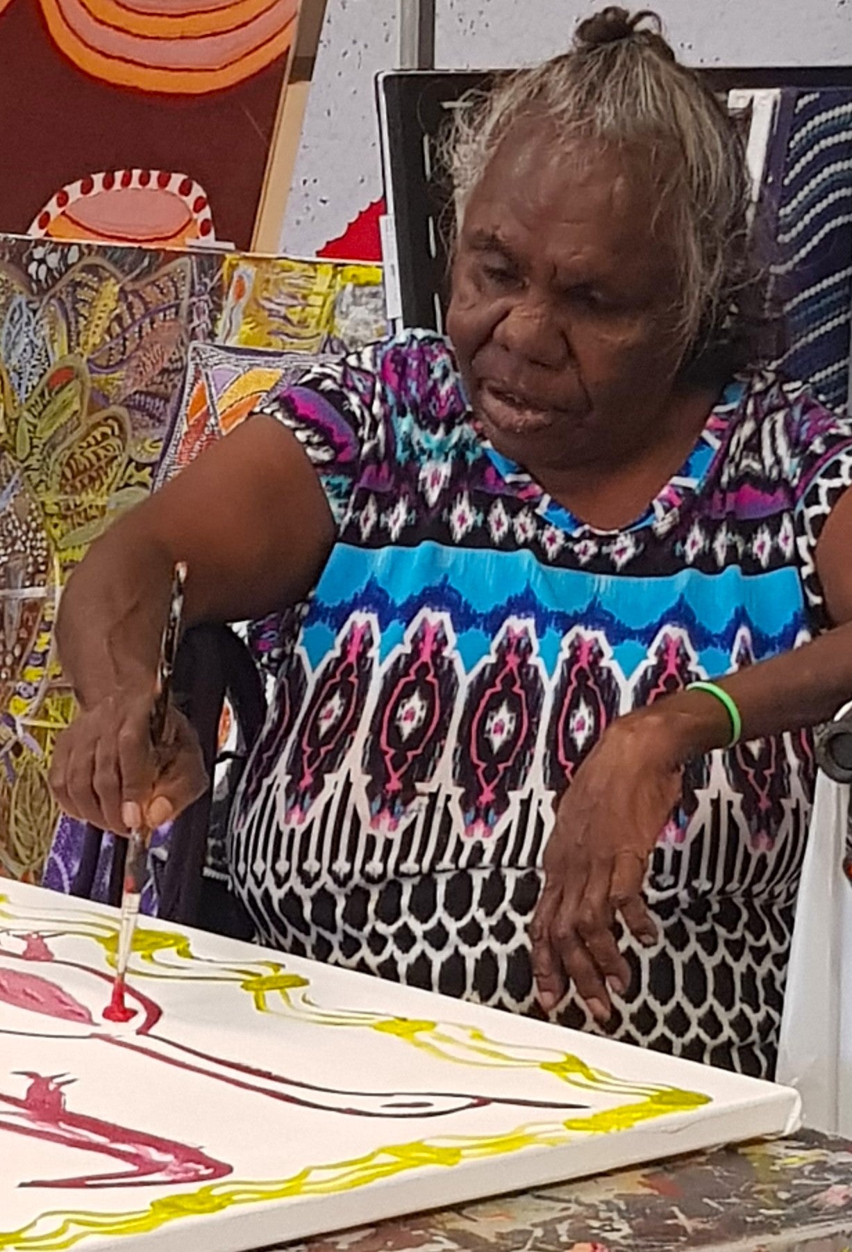 In the late 1990's Janet moved to Halls Creek and began painting food plants and animals that she grew up with. In latter years her work was about places on her country. Her favourite subjects included Brolga and water plants. She painted daily at Yarliyil Arts where she became one of the foremost senior members of the arts community.